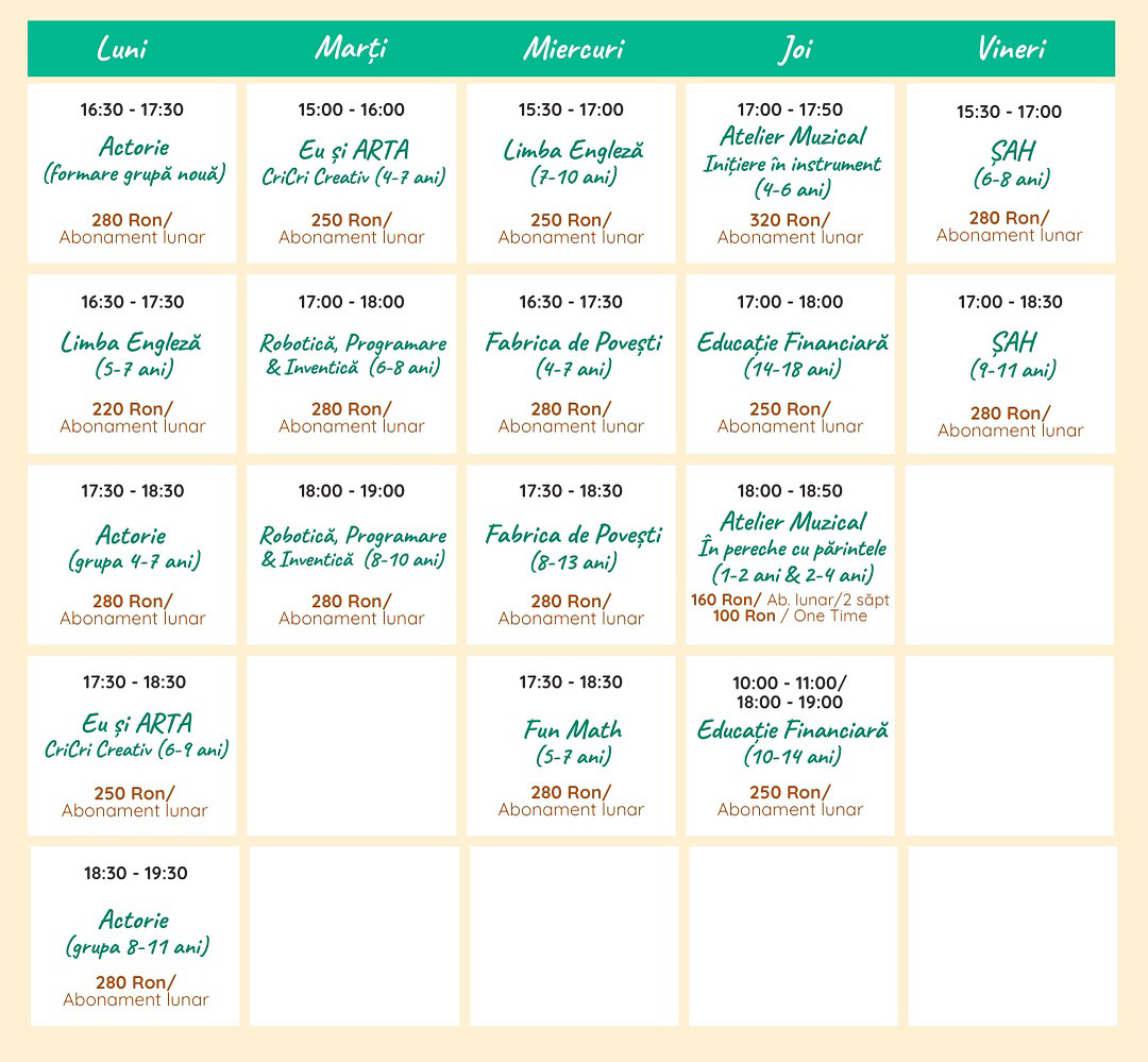 | 16:30- 17:30 ACTORIE / grupa avansati / 280 ron / abonament lunar | 15:00 -16:00 CriCri Creativ / EU si ARTA / 4 – 7 ani / 250 ron / abonament lunar | 15:30 – 17:00 Limba Engleza / 7 – 10 ani / 250 ron / abonament lunar | 17:00 – 18:00 Educatie financiara / 14 – 18 ani / 250 ron / abonament lunar | 14:00 - 15:30 SAH 9 – 11 ani/ 280 ron/ abonament lunar |